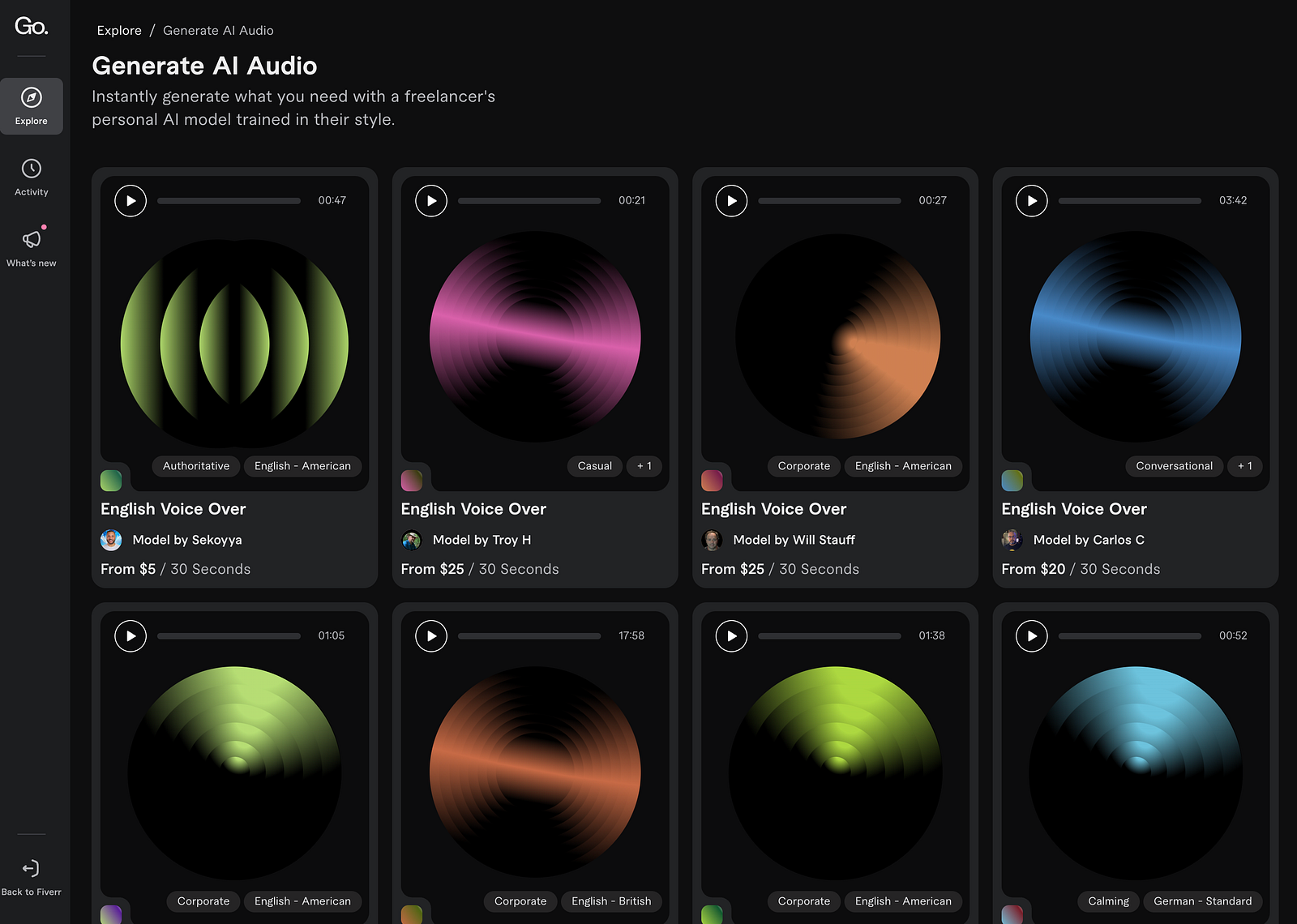 Another interesting approach comes from Fiverr Go, which blends AI with human creativity. Instead of relying purely on synthetic voices, Fiverr’s AI voice generator is trained on real voice actors. This means you still get AI speed, but with voices based on actual performers.