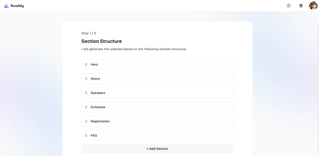 Readdy took a different approach. Instead of immediately generating the site, it showed me a section blueprint first — Hero, Speakers, Schedule, Registration, FAQs.