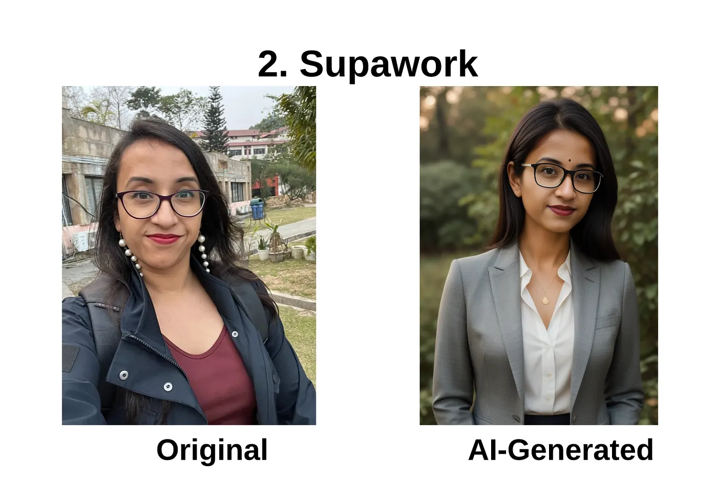 - In contrast, tools like Supawork AI and some free generators produced images that didn’t resemble my real face at all: different eyes, missing glasses, altered facial proportions. Those would immediately raise doubts on LinkedIn.