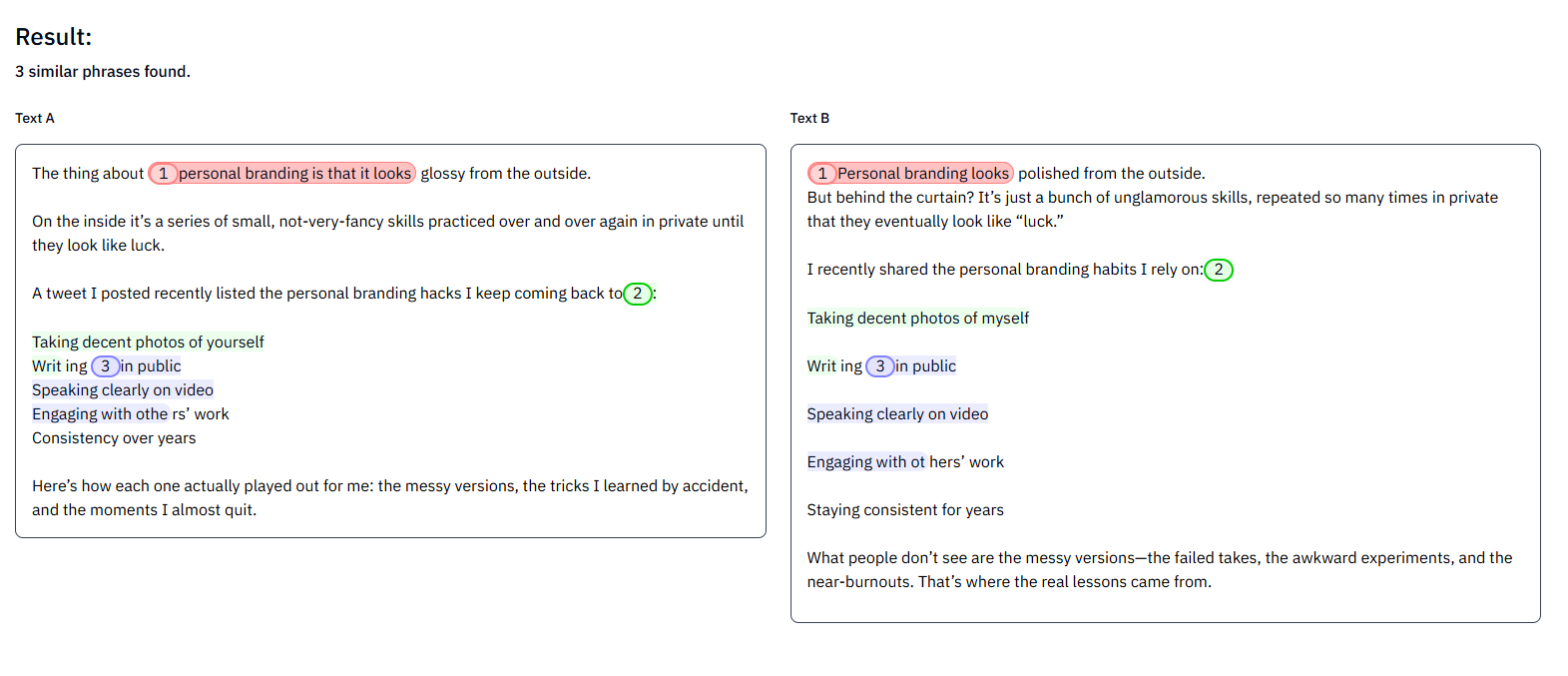 - Side-by-side text comparison