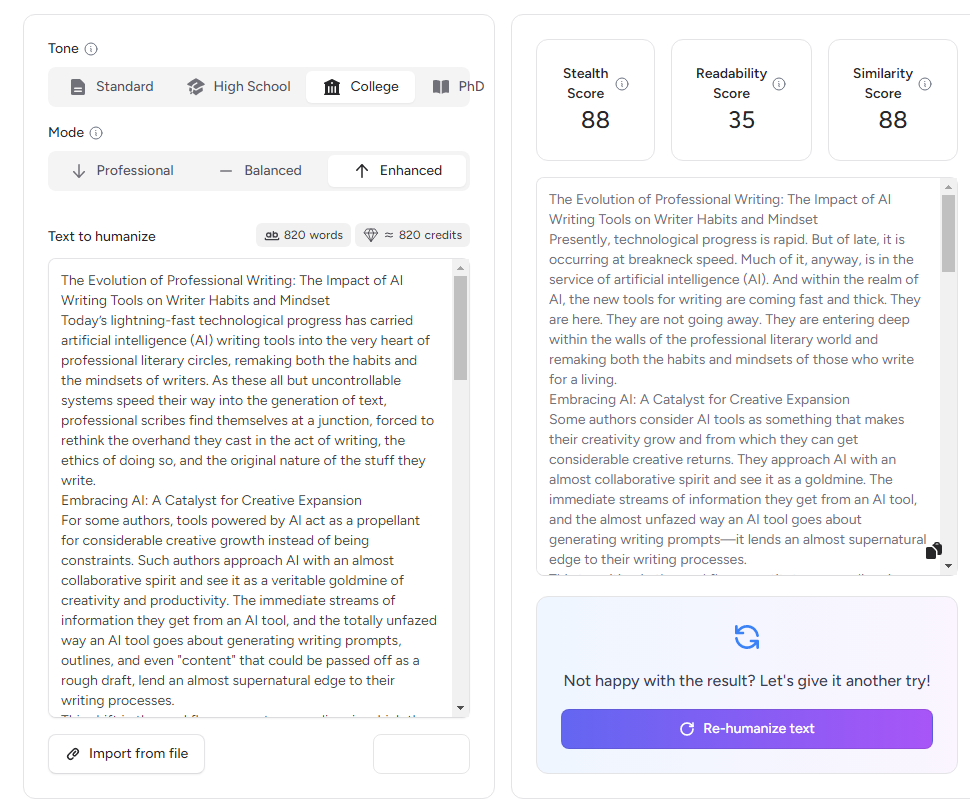 In long-form tests, GPTHuman.ai stood out here. When I ran 800–1,200 word blog sections through its Balanced and Enhanced modes, the structure improved without flattening the voice, as long as I followed up with a short human edit.
