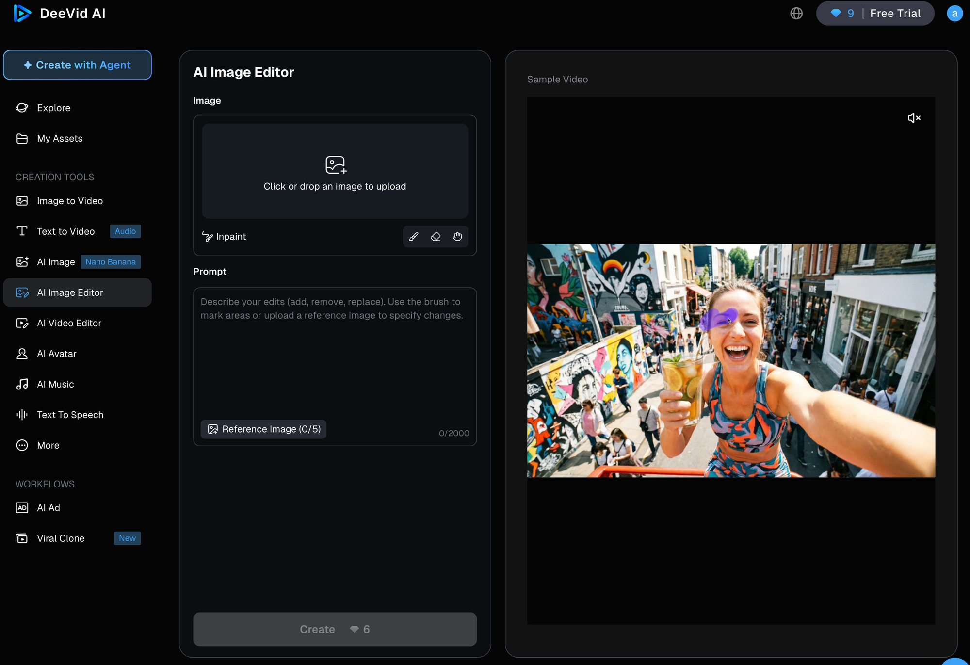 In my tests, DeeVid AI stood out not just because it produced strong images quickly, but because it treated the process like a workflow: editing was integrated (inpainting/outpainting, tweaks, iterations) rather than forcing a full restart every time.