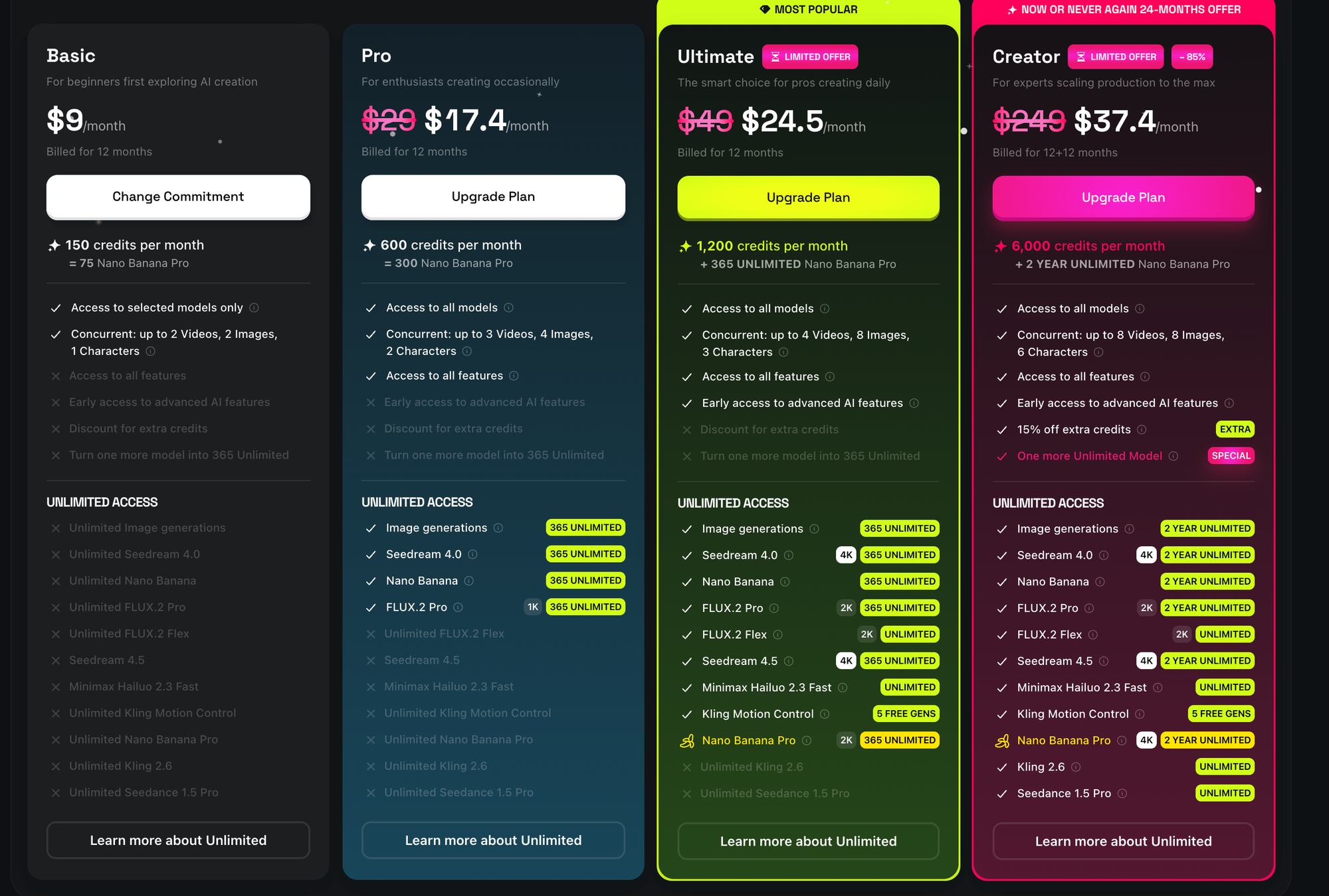 | Higgsfield | Hybrid (Daily free credits + Subscription) | ✅ 10 credits/day | $9/month (Basic), $17.4/month (Pro) | Credits per feature (image-to-video, lipsync, ads), model access | Social content, UGC ads, multi-model experimentation |